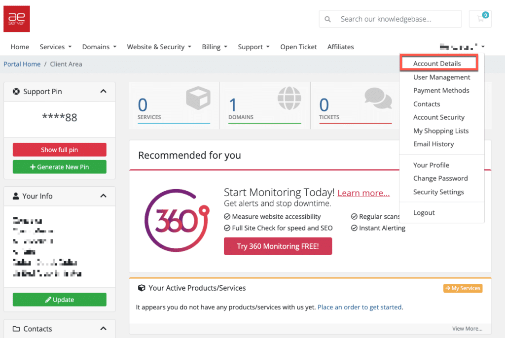 - Login to your client area – go to our website at aeserver.com and click my account in the top right corner