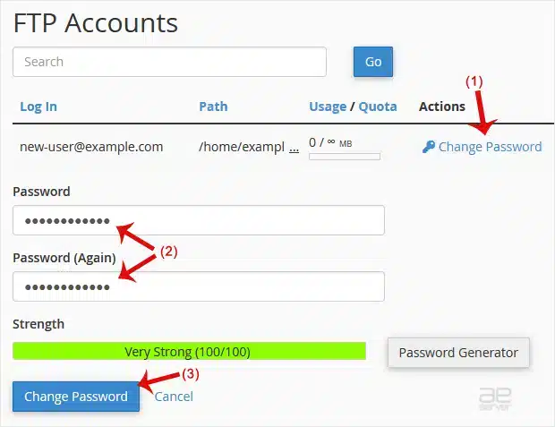 3. Under the list of FTP accounts, click on Change Password and enter a new password. Alternatively, use the password generator to generate one.