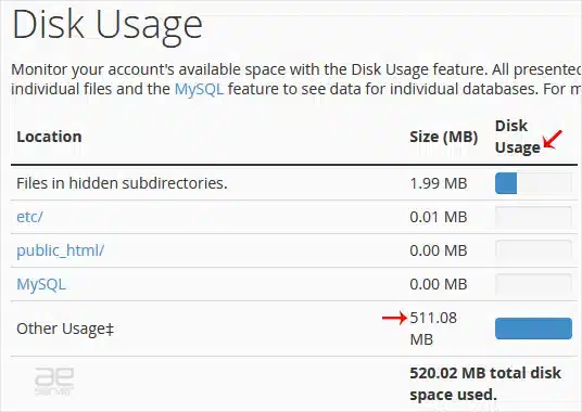 3. From the Disk Space Usage area, you can see which directory is using a lot of space and check the disk usage of MySQL.