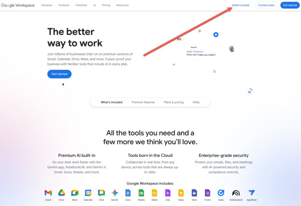 Access to Gmail, Calendar, Drive, Meet, and Admin tools