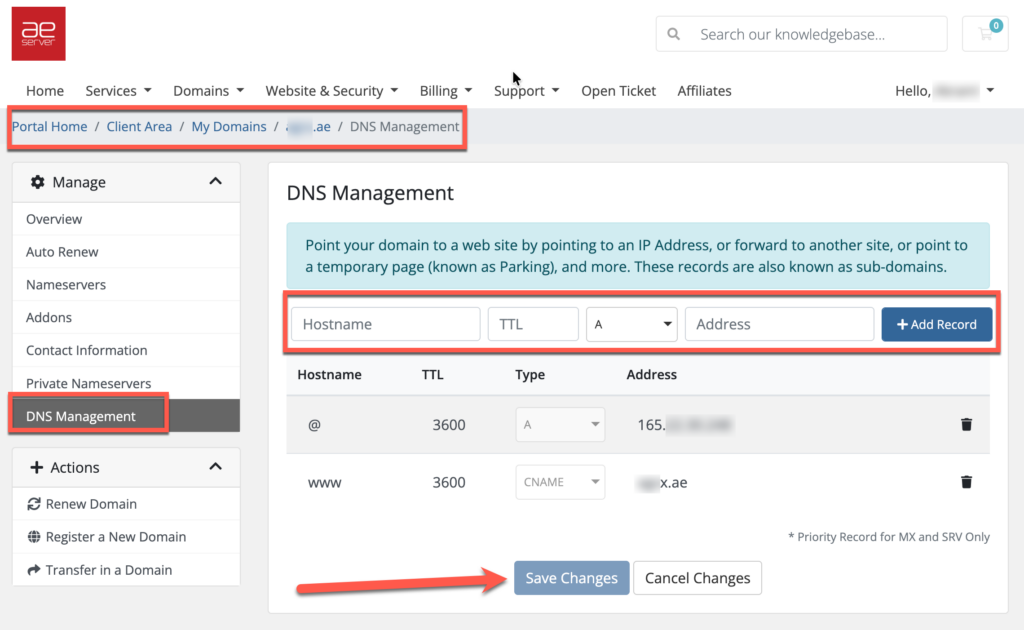 If you are not sure which record to edit, or if the domain already has a working website or email service, contact AEserver Support before making changes so we can help you avoid downtime.