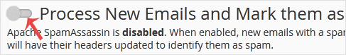 3. Toggle Process New Emails and Mark them as Spam to enable it. If the knob/toggle is greyed out, this indicates that Apache SpamAssassin is disabled.