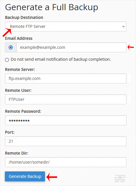 5. Once you fill in the Remote FTP details, click on Generate Backup.