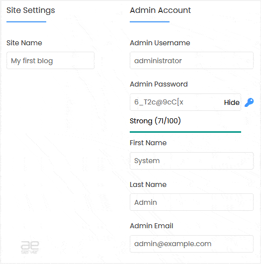 - Admin Username: Your new Dotclear username (for security reasons, do not use the administrator or the admin username).