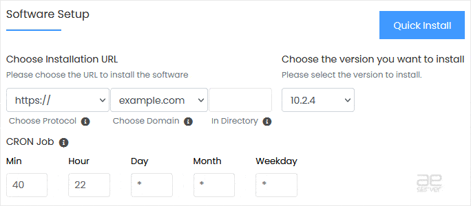 - Choose Installation URL: Choose the appropriate protocol/domain. Inside the “In Directory” field, should you want to install this in a directory, i.e., example.com/directory, enter the directory name. Otherwise, please, leave it blank to install in your main domain, i.e., example.com.