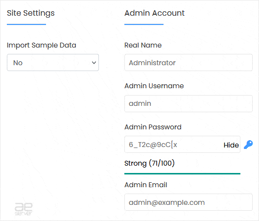 - Admin Username: Your new PluXml username (for security reasons, do not use the administrator or the admin username).