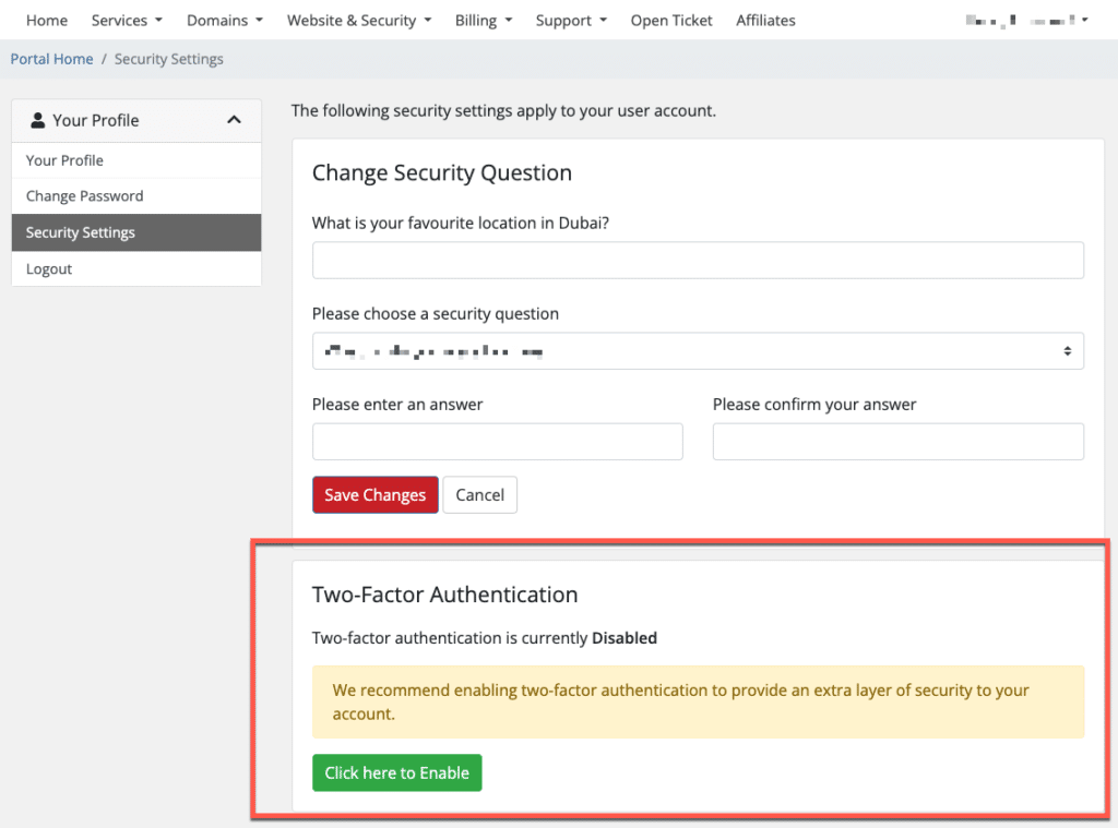 Once inside, you will see the Two-factor Authentication section and the current status.